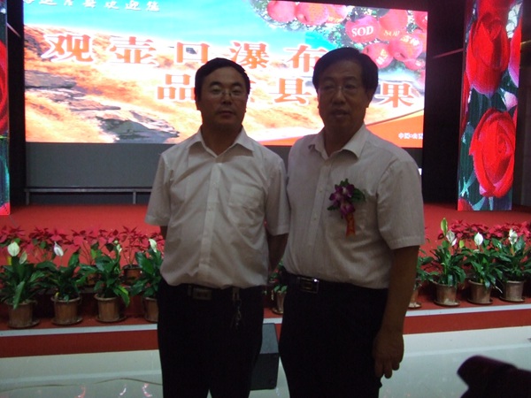 圖為吉縣蘋果(北京)銷售公司董事長郭小安與全國勞動模范、中國農產品市場協會執行會長、北京新發地農產品批發市場董事長張玉璽合影留念