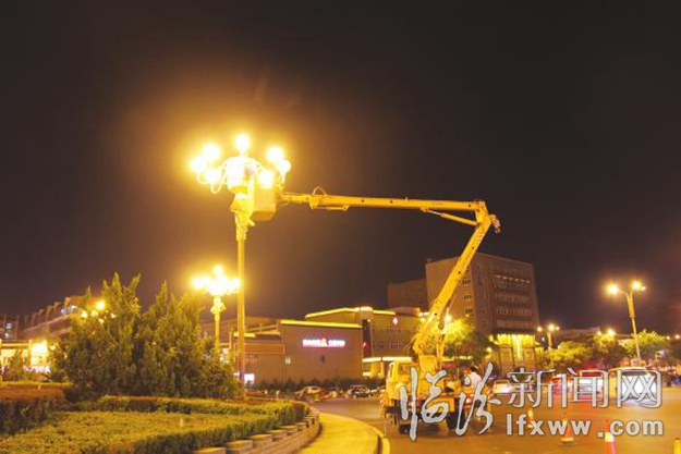 臨汾新聞網訊 近日,夜幕降臨,華燈初上。鼓樓環島處,在距離地面10來米的高空上,路燈管理所維護人員正在對路燈進行檢修。