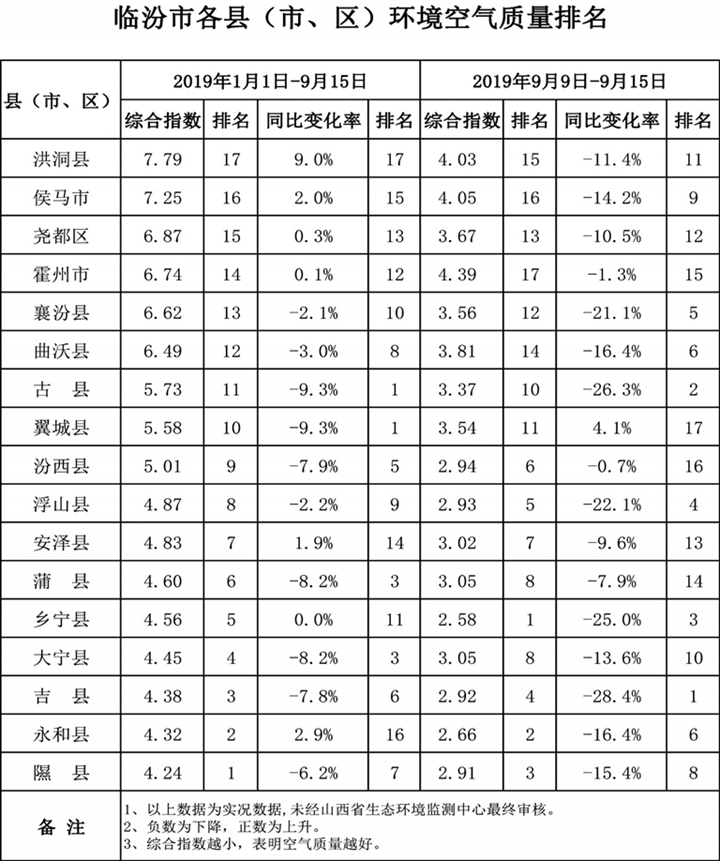 1、以上數據為實況數據,未經山西省生態環境監測中心最終審核。 2、負數為下降,正數為上升。