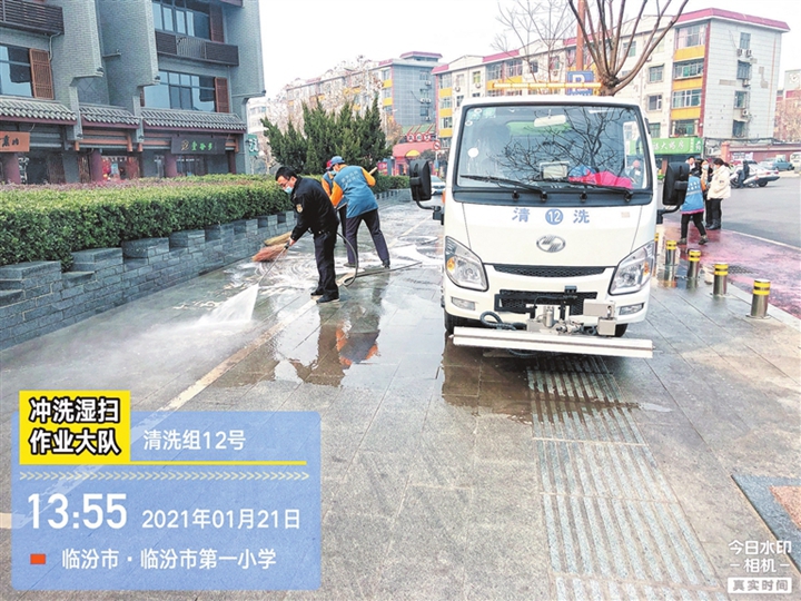 臨汾新聞網訊 為進一步鞏固靚城提質成果,美化亮化市區,日前,市城管局環衛服務中心沖洗濕掃大隊趁著氣溫回升的間隙,組織工作人員在市區向陽西路、鼓樓南北街、財神樓等精品街道開展了一次大清洗活動,干凈整潔的街道迎來市民的頻頻贊揚。圖為工作人員正在鼓樓附近清洗街道。