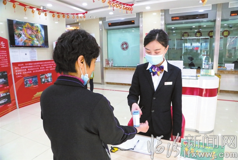 2月14日,正月初三。中午12時許,記者走進位于市區鼓樓北大街和向陽路十字路口西南側的中國銀行營業廳。大廳四周的墻壁上,懸掛著火紅的中國結、紅燈籠和精美的鏤空“福”字,滿滿都是濃郁的春節氛圍。