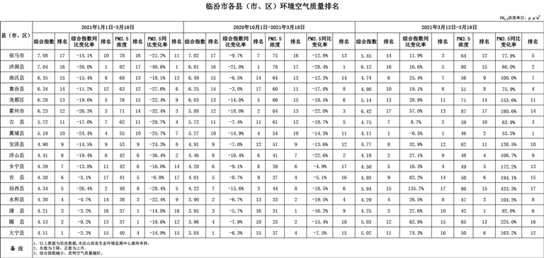 1、以上數(shù)據(jù)為實(shí)況數(shù)據(jù),未經(jīng)山西省生態(tài)環(huán)境監(jiān)測(cè)中心最終審核。 2、負(fù)數(shù)為下降,正數(shù)為上升。 3、綜合指數(shù)越小,表明空氣質(zhì)量越好。