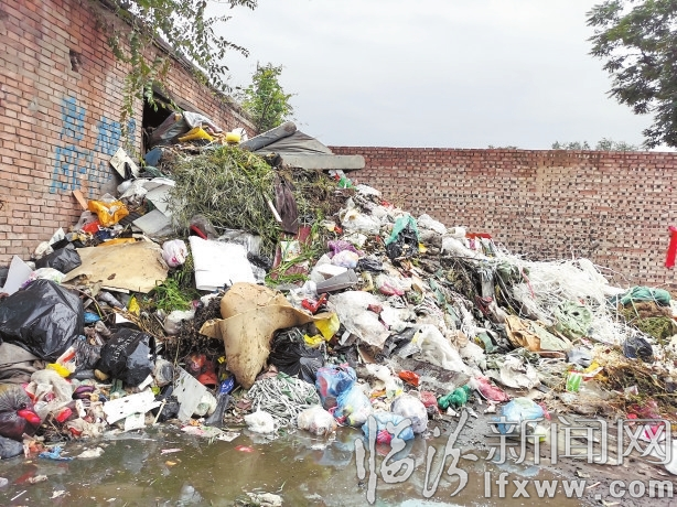 在段店鄉(xiāng)李堡村金太陽(yáng)幼兒園西側(cè)的一處垃圾池,堆積的生活垃圾甚至高出了旁邊的圍墻,地面上流淌著垃圾堆里滲出的污水。記者看到,這處垃圾堆全部是生活垃圾,其中不乏已經(jīng)腐壞的瓜果皮核、殘羹剩飯,散發(fā)著濃重的臭味。一位過(guò)路的村民說(shuō):“這么多垃圾,惡心難看還不衛(wèi)生,兩三輛垃圾車都裝不上,也不知道要等到什么時(shí)候,希望能趕緊進(jìn)行清理。”
