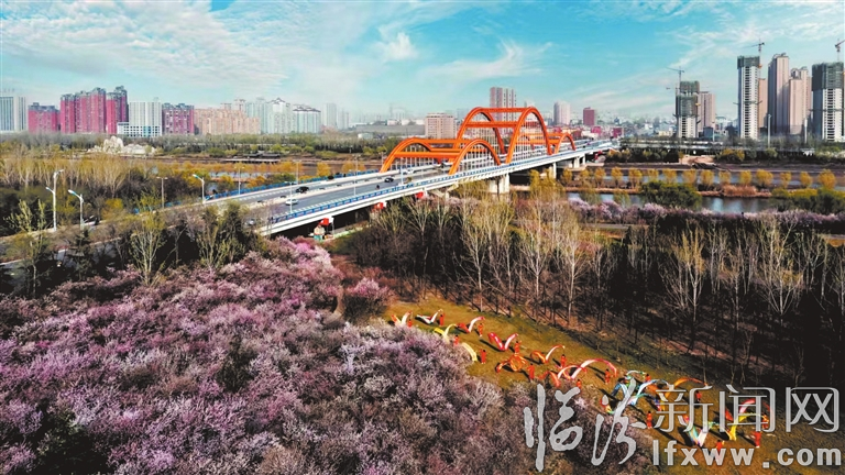 臨汾新聞網訊 春回大地、萬物復蘇,市區迎來了難得的好天氣。佇立在汾河公園西側的高樓上向東眺望,映入眼簾的是色彩鮮明的彩虹橋、湛藍如洗的天空、爭奇斗艷的桃李、載歌載舞的市民、充滿生機的汾河……好一幅生態美景。圖為汾河公園美景。記者 劉 超 攝