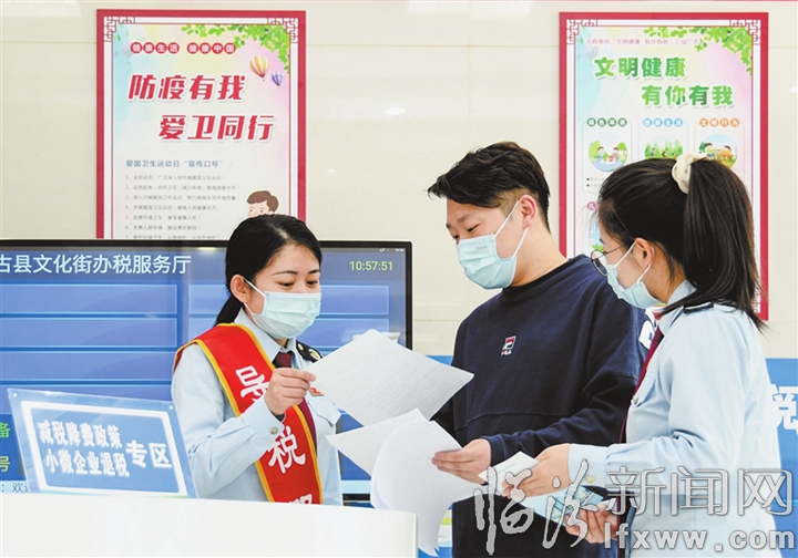 臨汾新聞網訊 連日來,國家稅務總局古縣稅務局積極落實增值稅留抵退稅政策,在辦稅大廳設立小微企業退稅專區,直接為市場主體提供現金流,有效緩解企業資金壓力。圖為稅務人員正在為小微企業財務人員講解相關稅費優惠政策。記者 閆銳鵬 攝