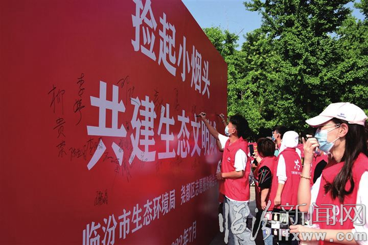 臨汾新聞網訊 7月28日,市生態環境局、堯都區委宣傳部、堯都區志愿服務聯合會聯合動員大學生志愿服務隊,在堯都公園開展了“撿起小煙頭,共建生態文明城”活動。志愿者們在環保簽名墻上簽名,并向過往群眾發放密封袋、環保購物袋、口罩、手套等物品。圖為活動現場。