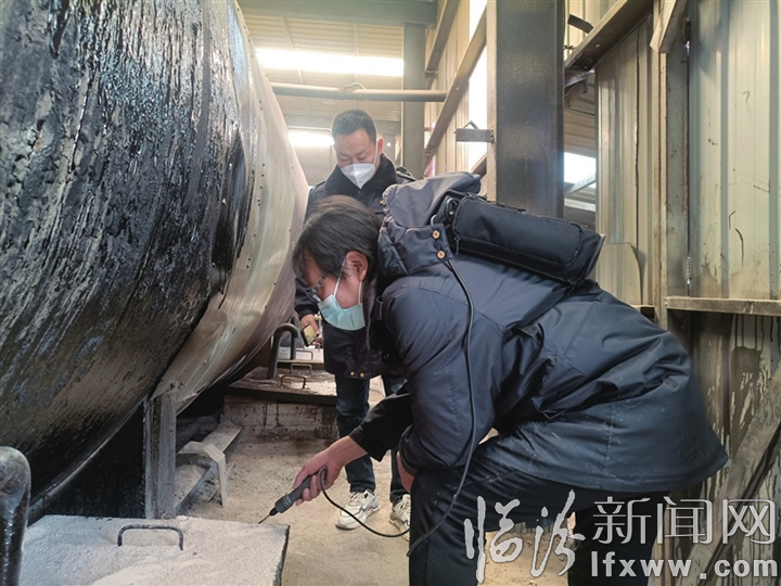 臨汾新聞網訊 隨著“秋冬防”攻堅戰的持續深入,連日來,市生態環境局綜合行政執法隊以分局交叉執法、市局督導檢查等方式,不斷加大環境執法監管力度,全面落實環保管控措施。圖為12月17日,環境執法人員深入堯都區宏坤通公路工程有限公司生產車間,運用便攜式揮發性有機氣體檢測儀查找漏點。