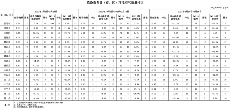 1、以上數(shù)據(jù)為實(shí)況數(shù)據(jù),未經(jīng)山西省生態(tài)環(huán)境監(jiān)測中心最終審核。 2、負(fù)數(shù)為下降,正數(shù)為上升。3、綜合指數(shù)越小,表明空氣質(zhì)量越好。