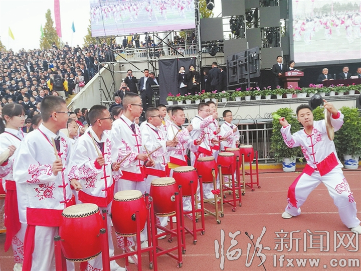 臨汾新聞網訊 臨汾同盛實驗中學建校10年來,堅持文化興校、文化育人,開展了傳統文化進校園活動,讓孩子們在活動中接受傳統文化熏陶,增強文化自信,厚植家國情懷,夯實成長成才的根基。圖為該校師生表演云龍花鼓的情景。