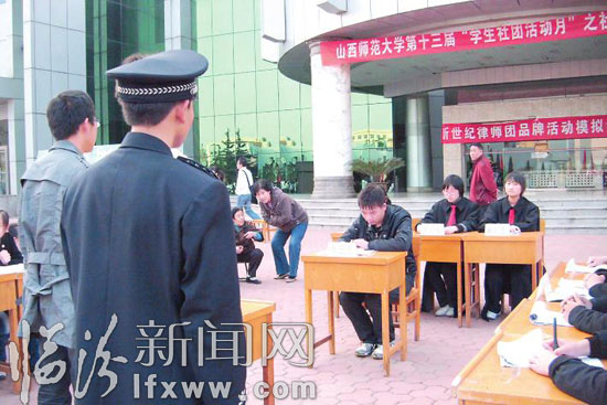 在這些展示中,引人注目的還有新世紀(jì)律師團組織的模擬法庭。公正嚴(yán)明的“審判長”、垂頭喪氣的“原告”、后悔莫及的“被告”、冷面無私的法警,法庭雖小,卻折射出社會大舞臺的人間萬象。法庭上公訴人與律師雄辯滔滔,法官依法斷案,老師現(xiàn)場發(fā)表點評,讓觀眾學(xué)到不少法律知識。據(jù)該社負(fù)責(zé)人介紹,社團成立于1995年,在十五屆社團負(fù)責(zé)人的領(lǐng)導(dǎo)下不斷地發(fā)展本社團品牌特色活動——模擬法庭、法庭旁聽,將每一次活動賦予法治的精神,讓同學(xué)在活動中了解法律,鍛煉自己。