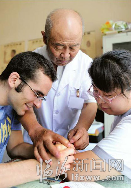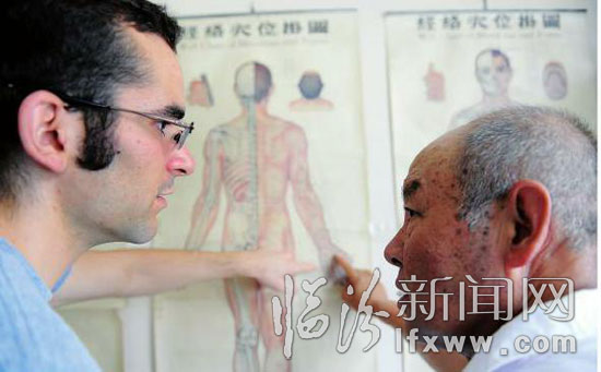 杜春青中醫在為洋徒弟倪百安講解人體穴位與經絡。