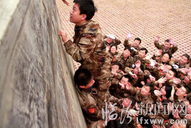 我們拓展培訓的最后一個項目是翻越高墻,是全體隊員一起參加的項目??吹揭欢?米多高的鐵板墻,無任何借助物件,我懷疑自己能否上去。當大家站在那堵墻下面集合的時候,大個子男隊員奮勇當先,甘為人梯,讓其他隊員踩在自己肩上翻越高墻,那種場面太感人了。尤其在最后只剩下幾個人時,全體隊員為他們加油,一個一個很順利地都翻過了高墻。團隊的力量是無窮的,沒有什么克服不了的。