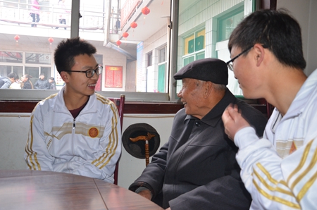 89歲的楊連慶老人身體依舊硬朗,坐在院子的長椅上曬太陽。“爺爺,您還記得我嗎?”地理科學院學生王雪來到老人的身邊蹲下身子問道。“記得,你就是上次來的那個小姑娘。”老人頓時喜笑顏開,喜歡熱鬧的他給孩子們唱起了“東方紅,太陽升...”