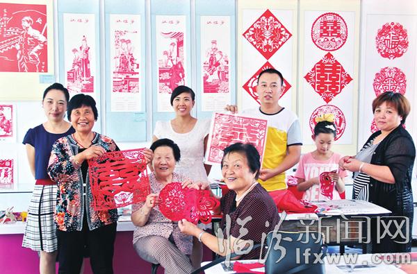 圖為首期剪紙藝術培訓班的學員在展示作品。