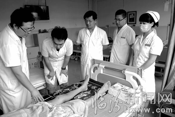 臨汾新聞網訊 近年來,市骨科醫院手外二科結合科室特點不斷提高業務技術,先后成功治療了多例斷臂再植術、雙上肢多發離斷傷再植術、牽拉成骨技術治療復雜性骨髓炎,受到患者的好評。圖為手外二科醫生申彥武和醫護人員在為術后患者查看傷口恢復情況。記者 鄭遠飛攝
