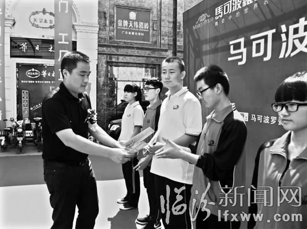 圖為8月22日,馬可波羅瓷磚慈善基金和市慈善總會向臨汾二中10名考上大學的貧困學子每人發放3000元助學金。記者 李自強攝