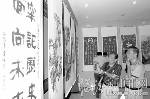 臨汾新聞網(wǎng)訊 日前,書畫愛好者在我市群眾藝術館觀看展覽。當日,民盟臨汾市委舉辦了“紀念抗日戰(zhàn)爭勝利70周年”書畫展,以書畫、剪紙、攝影的形式紀念抗日戰(zhàn)爭的偉大勝利。記者 閆銳鵬攝