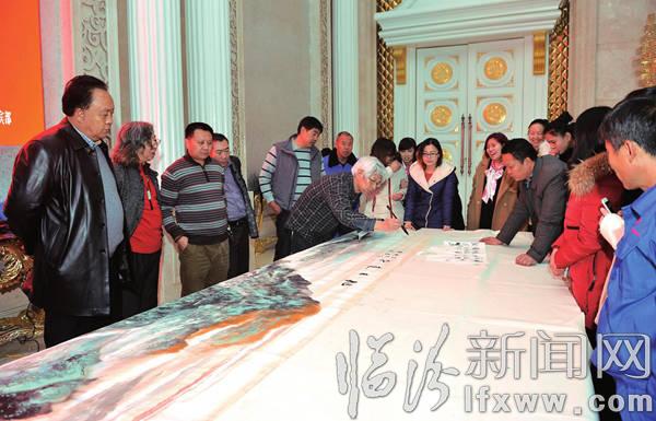 臨汾新聞網訊 1月2日,我市華堯集團舉行了一場特殊的迎新春團拜會,邀請北京湖社畫會的10余名書畫家和集團600余名員工共慶新年。活動現場,書畫家結合臨汾的豐厚歷史底蘊,現場創作了巨幅山水畫卷。在濃濃的書香氣氛中,喜迎新年的到來。記者 閆銳鵬 攝