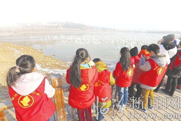 小記者們近距離觀賞這些天鵝,岸邊還有眾多攝影愛好者端著“長槍短炮”拍攝。漂亮美麗的白天鵝時而飛翔水面,時而引項高歌,彼此追逐嬉鬧,吸引了小記者們的眼球,拿出相機互相拍照留念。