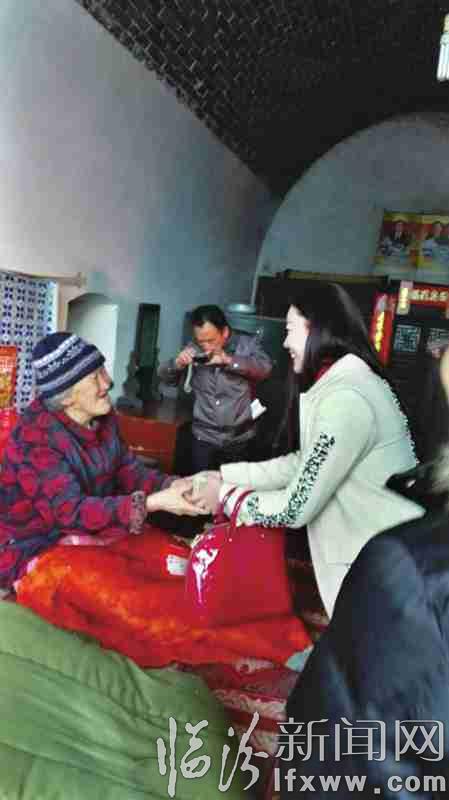 臨汾新聞網(wǎng)訊 1月27日,在新春佳節(jié)來臨之際,中國美女會臨汾分會會長王美瀅組織部分會員,籌集善款3780元,購買了面粉、被褥等生活必需品,前往汾西縣僧念鎮(zhèn)澗子村,看望了臥病在床、生活不能自理、家境貧寒的村民。圖為會長王美瀅慰問村民時的情景。 雁子 攝