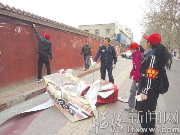 當(dāng)天上午,志愿者分為兩隊(duì),分別前往貢院街、平陽南街小商販經(jīng)常扎堆擺攤的路段,向臨街的單位、門店進(jìn)行宣傳,并協(xié)助市容管理隊(duì)員拆除臨街兩側(cè)亂設(shè)的二級管燈箱和廣告牌,清除臨街店外堆放的商品、雜物等。