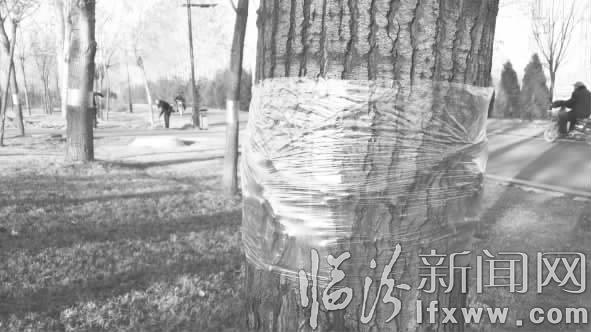 臨汾新聞網訊 春天來了,萬物復蘇,然而許多危害植物的害蟲也“破土而出”。3月28日,記者在汾河公園看到,園林工人正在給綠植的樹干上纏繞保鮮膜防止害蟲的侵擾。