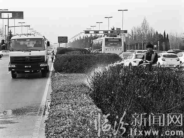 臨汾新聞網訊 連日來,市園林綠化部門對市區主干街道的樹木、綠化帶等進行了春澆施肥,同時對缺失、枯死樹木進行補栽,為全面建設生態園林城市做貢獻。圖為綠化二隊工作人員正在為濱河東西路綠化帶澆水。 記者 范韶華 攝