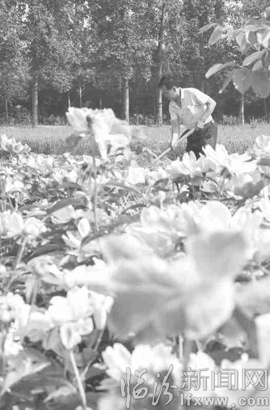 近日,在臨汾機(jī)場大道兩側(cè),當(dāng)?shù)卮迕穹N植的芍藥艷若朝霞,花香沁人。