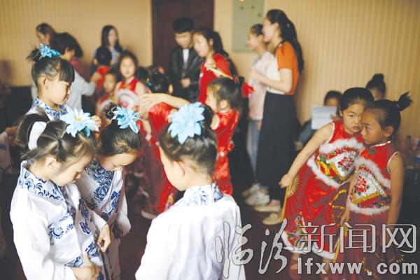 “集合,集合!馬上該我們上場了,聽老師的口令,深呼吸,全身放松,兩人一組,開始伸展運動……”在后臺的排練室內,即將登場表演舞蹈《青花瓷》的一群孩子們,身著一席幽蘭雅致的服裝,在老師的指導下,進入了倒計時的“沖刺狀態”。