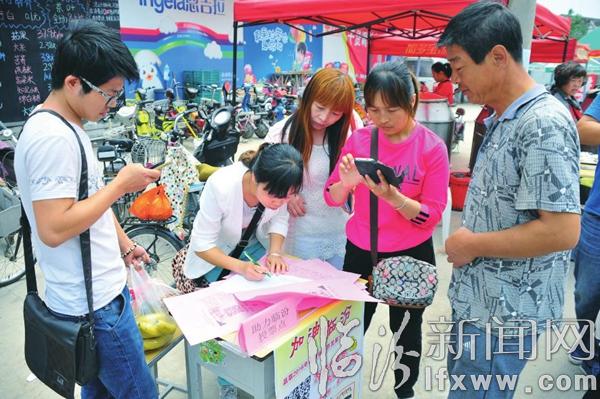 圖為堯都區(qū)賈得鄉(xiāng)志愿者在集貿市場組織過往群眾掃描投票。劉凱杰 攝