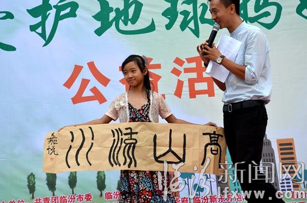環保知識有獎競答與才藝展示,在現場掀起一陣又一陣熱浪。在書寫環保漢字環節,市第一小學四年級學生胡嘉悅帶來了篆書作品《高山流水》,她道出了自己的心愿:保護環境是每個人應盡的責任與義務,不僅自己要爭當環保小衛士,還要提醒周圍的人,讓大家都做環保衛士。”