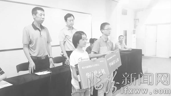 臨汾新聞網訊 7月8日,在臨汾市第一中學高中部禮堂,由民盟臨汾市委發起的“愛心企業向全市文、理科最高分獲得者捐贈獎品”活動正在進行,我市愛心企業臨汾“網蟲電腦”公司向2016年度全市高考文理科最高分獲得者巨博源、劉陽分別捐贈了一臺筆記本電腦,獎勵他們在高考中取得了優異的成績,希望他們在今后的道路上能取得更多傲人的成績。 記者 楊全 攝