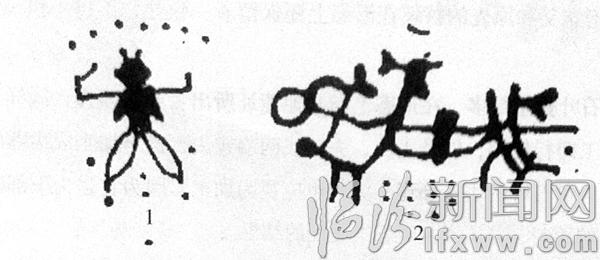 “柿子灘”臺地西端一道突出“巖棚”下的巖石上面,畫有兩幅表現遠古時期“母系部族”生活內容的古老巖畫。他認為這兩幅巖畫的內容,一幅是表現遠古時期母系部族狩獵生活的“雙鹿圖”,另一幅則是表現女媧“煉石補天”和“化生萬物”內容的“母親崇拜”圖。從巖畫的面積大小來看,位于巖石右側的“雙鹿圖”的尺寸大約是“母性崇拜”圖的三至四倍,畫面上雌鹿無角,雄鹿的鹿角明顯,這一畫面說明:當時在這一帶居住、活動的母系部族已經進入對糜鹿一類性情溫和的獸類的馴養階段;這兩幅巖畫也不是后來其他時期的人們所畫。