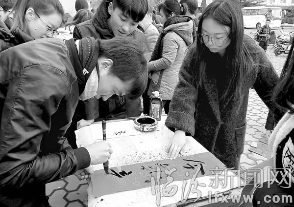 臨汾新聞網(wǎng)訊 近日,山西師范大學(xué)書法學(xué)院學(xué)生們?cè)谛?nèi)外舉辦了“迎新春,送春聯(lián)”活動(dòng)。此次活動(dòng)旨在弘揚(yáng)了中國(guó)傳統(tǒng)文化藝術(shù),傳承歷史文化內(nèi)涵,展示書法藝術(shù)魅力,繁榮書法藝術(shù)。 饒二保 趙嘉麗 攝