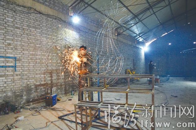 在點焊車間,一位工人對照著一比一的圖紙,正小心翼翼地用鐵絲捏制燈組的輪廓。他的手指靈巧地上下飛舞,漸漸勾勒出了“2017”。其中,“0”里還藏著一只“大公雞”。想要完美呈現這一造型,不僅費時費力,還需要高超的技藝與時尚的審美。