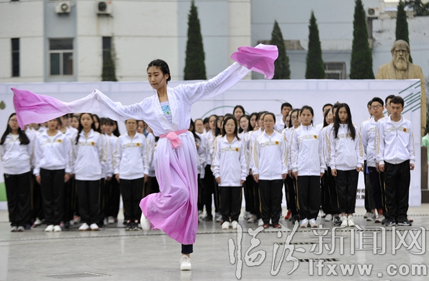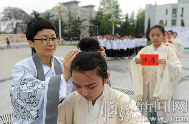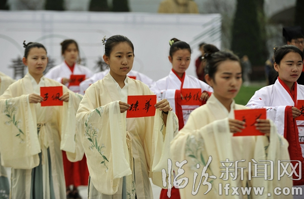 臨汾新聞網訊 2017年4月15日,在山西師范大學巨人廣場,朝歌漢服社的社團成員在進行漢服禮儀表演。當日,由山西師范大學美術學院主辦、美術學院朝歌漢服社承辦的以“筓冠成人,筑夢青春”為主題的中華傳統漢服成人禮活動舉辦,通過展現男冠女笄的中華傳統成人禮,使廣大學生認識中國傳統文化的內涵,提升個人綜合素養,領略古代禮儀魅力,將傳統文化與現代精神有機結合,激勵大學生培養“仁義禮智信”的良好美德。
