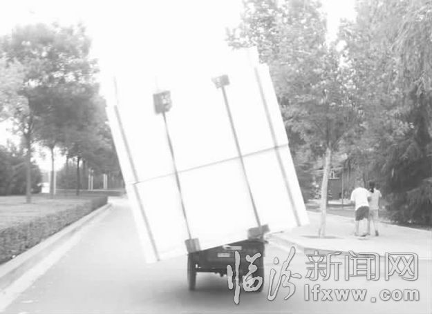 臨汾新聞網訊 7月4日下午,一輛滿載著塑料泡沫的三輪車行駛在濱河東路,被風一吹超高超寬的泡沫頓時歪向一側,存在安全隱患。