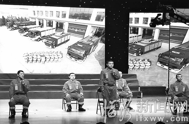 臨汾新聞網訊 8月1日晚,臨汾消防支隊消防戰士正在表演小品《忠誠》。當天,慶祝中國人民解放軍建軍90周年“軍民魚水情·共筑中國夢”文藝晚會在梨園堂舉行。整場演出主題突出,形式新穎,感人至深,催人奮進,為消防官兵獻上了一臺精彩的“文化大餐”,譜寫了一曲軍愛民、民擁軍、軍民團結一家親的動人樂章。