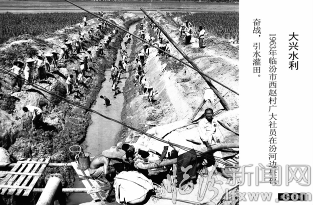 臨汾新聞網訊 1963年,臨汾市西趙村廣大社員在汾河邊晝夜奮戰,引水灌田。