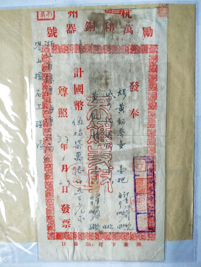 正中間紅色圖案組成的邊框內(nèi)為發(fā)票內(nèi)容。其中有發(fā)奉“大號黃銅茶壺一把,紫銅鍋一只,每斤計重……”等文字。通過發(fā)票記載內(nèi)容可知,當時銅茶壺與紫銅的價格為“伍拾柒萬陸仟五百元正(整)”。發(fā)票的開具時間為:民國三七年一月二十九日。時間下還有繁體的“發(fā)票”二字。發(fā)票的付款單位寫在最左側:浙江省錢塘江海塘工程局湯山探石工程隊。發(fā)票最右側下端還有4個不同內(nèi)容的篆書印章。