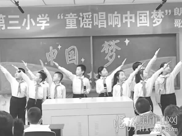 臨汾新聞網(wǎng)訊 “在我的心里,一直有一個(gè)夢(mèng),一個(gè)輝煌的中國夢(mèng)!夢(mèng)中孩子們那一張張?zhí)煺娴男δ槪痪褪浅錆M希望的中國夢(mèng)嗎?希望我的祖國,像花兒一樣盛開,怒放于世界民族之林!”近日,市第三小學(xué)舉辦了“童謠唱響中國夢(mèng)”朗誦比賽,同學(xué)們以最真摯的情感表達(dá)了聽黨話、跟黨走、從小樹立愛黨愛國的思想感情。 記者成華攝