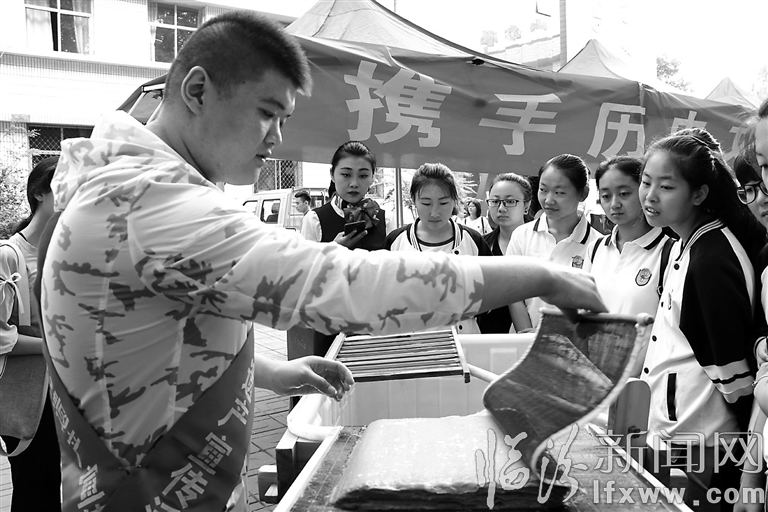 “以前我只知道有花饃,沒想到有這么多好東西!”市第一小學6年級8班的王鈿源,周末學完興趣課路經臨汾學院時聞聲來到展示攤位前,只見她一會兒坐上丁村土布的織布機在姥姥的指揮下手腳并用,一會兒目不轉睛地盯著平陽麻箋的現場演示挪不動步。問及為何對這兩個項目感興趣,小女孩說:“因為我喜歡服裝,土布可以做衣服,但我不知道布是怎么織出來的;因為周末我學書法要用到紙,但我不知道紙是怎么造出來的,感到它們都很神奇,所以想學一下呀!”