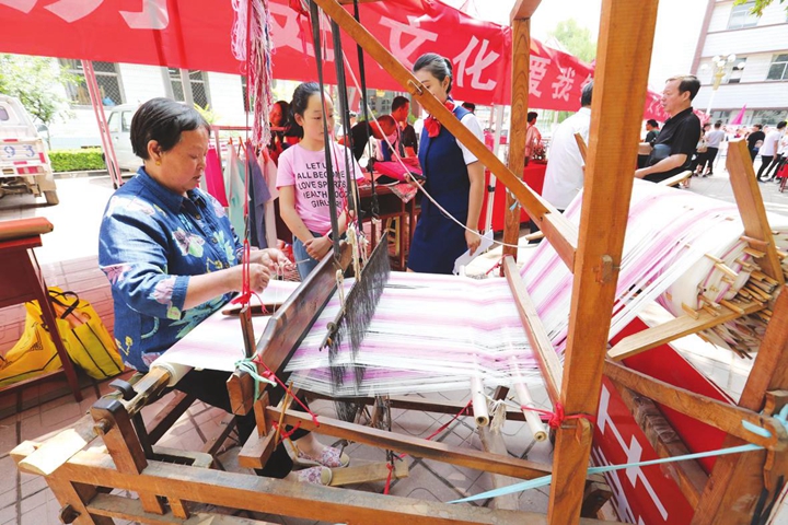 傳統(tǒng)美術(shù)類非遺平陽木版年畫省級(jí)傳承人趙國琦,耐心指導(dǎo)學(xué)生們拓印木版年畫。一個(gè)個(gè)手拿“產(chǎn)品”的學(xué)子們得意洋洋地走了,后續(xù)的人又排成了一條長(zhǎng)龍。襄汾丁村土布織機(jī)旁,圍滿了好奇的人,看著織布藝人熟練地拉著梭,織出一寸寸精細(xì)的土布,一個(gè)小伙子大膽上前,在老藝人的指導(dǎo)下學(xué)習(xí)拉梭,笨手笨腳的樣子讓人忍俊不禁。