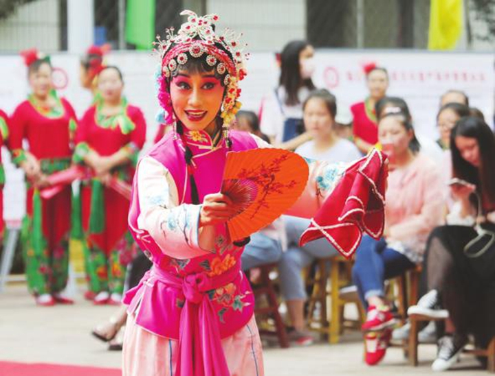 校園里的展板區(qū),格外引人注目。一位小姑娘一邊走一邊數(shù),300個(gè)項(xiàng)目令她感嘆;另一組展版,圖文并茂地介紹了臨汾21項(xiàng)國家級(jí)非物質(zhì)文化遺產(chǎn)。氣壯山河的晉南威風(fēng)鑼鼓,歡快、熱烈、動(dòng)感的翼城花鼓,驚、險(xiǎn)、奇、絕、美的天塔獅舞,慷慨激昂的蒲州梆子,綿延四千年的三月三走親,牽掛全球華人的大槐樹祭祖,莊嚴(yán)隆重的四醮朝山,氣勢(shì)磅礴的尉村跑鼓車……同學(xué)們不時(shí)停下腳步,記錄了一個(gè)個(gè)美好瞬間。