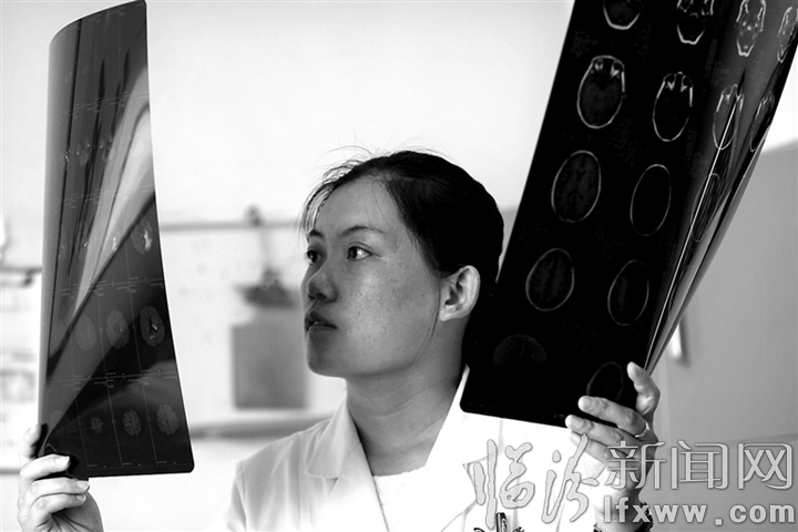 圖為該院呼吸科大夫正在仔細查看患者頭顱CT。