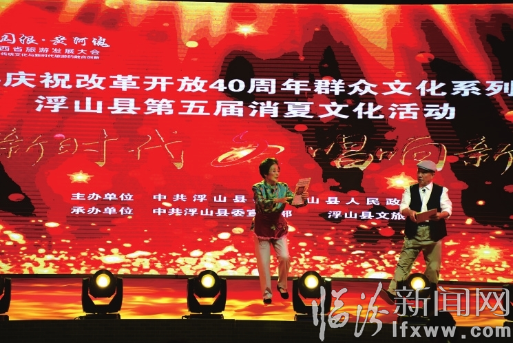 近日,浮山縣舉辦了以“放歌新時代、唱響新征程”為主題的慶祝改革開放40周年群眾文化系列活動。縣老年大學紅楓演唱隊、西街夕陽紅俱樂部等4支老年藝術團隊進行了專場演出。圖為小品《老兩口學十九大》。(浮宣)