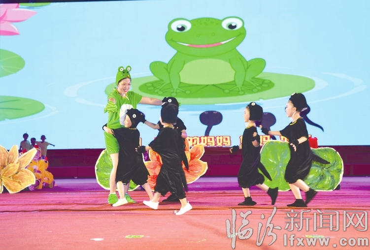 7月19日,曲沃縣廣場文化月舉辦多益英語“華年璀璨織夢行云”英語專場晚會。19個節目一一上演,展示了學生良好的英語素質。圖為幼兒話劇《小蝌蚪找媽媽》。(張榮 攝)