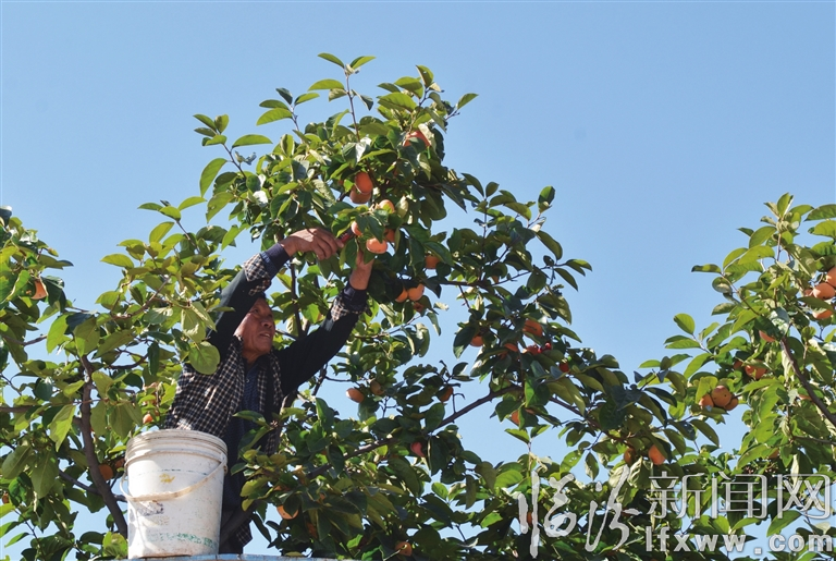 近日,曲沃縣磨盤嶺農業觀光區,滿山的柿子掛滿枝頭,殷師傅正在采摘紅透的甜柿。一眼望去,70余畝的甜柿園里一片豐收景象,這里生產的柿子即摘即食,肉質松脆,口味甘甜,每年都吸引山東、河南等大量外地客商前來收購。(張榮 攝)