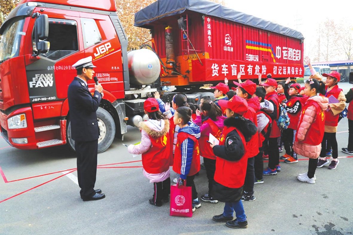 要牢記爭做交安“小使者”最后,小記者來到了停車場,他們被眼前的一輛大貨車吸引,交警告訴小記者,大貨車的盲區很多。在生活中,如果遇見大貨車,一定要保持距離,以免對自己的安全造成威脅。