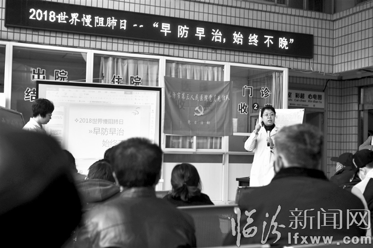 臨汾新聞網(wǎng)訊 為配合第17個世界慢阻肺日宣傳活動,近日,市第三人民醫(yī)院舉辦了相關健康知識講座。圖為該院呼吸科醫(yī)生們給住院患者及群眾講解慢性阻塞性肺疾病的健康知識。